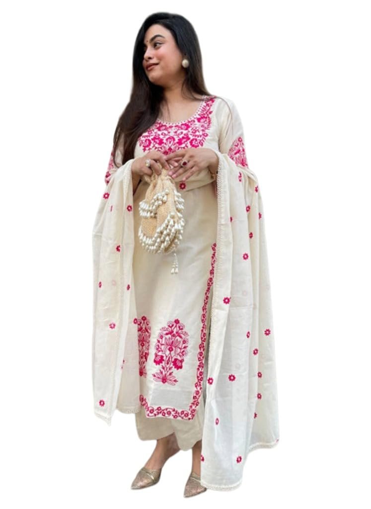 GoSriKi Women’s Rayon Viscose Embroidered Straight Kurta with Pant & Dupatta (JIVANTA Cream-GS_L_Cream_Large)