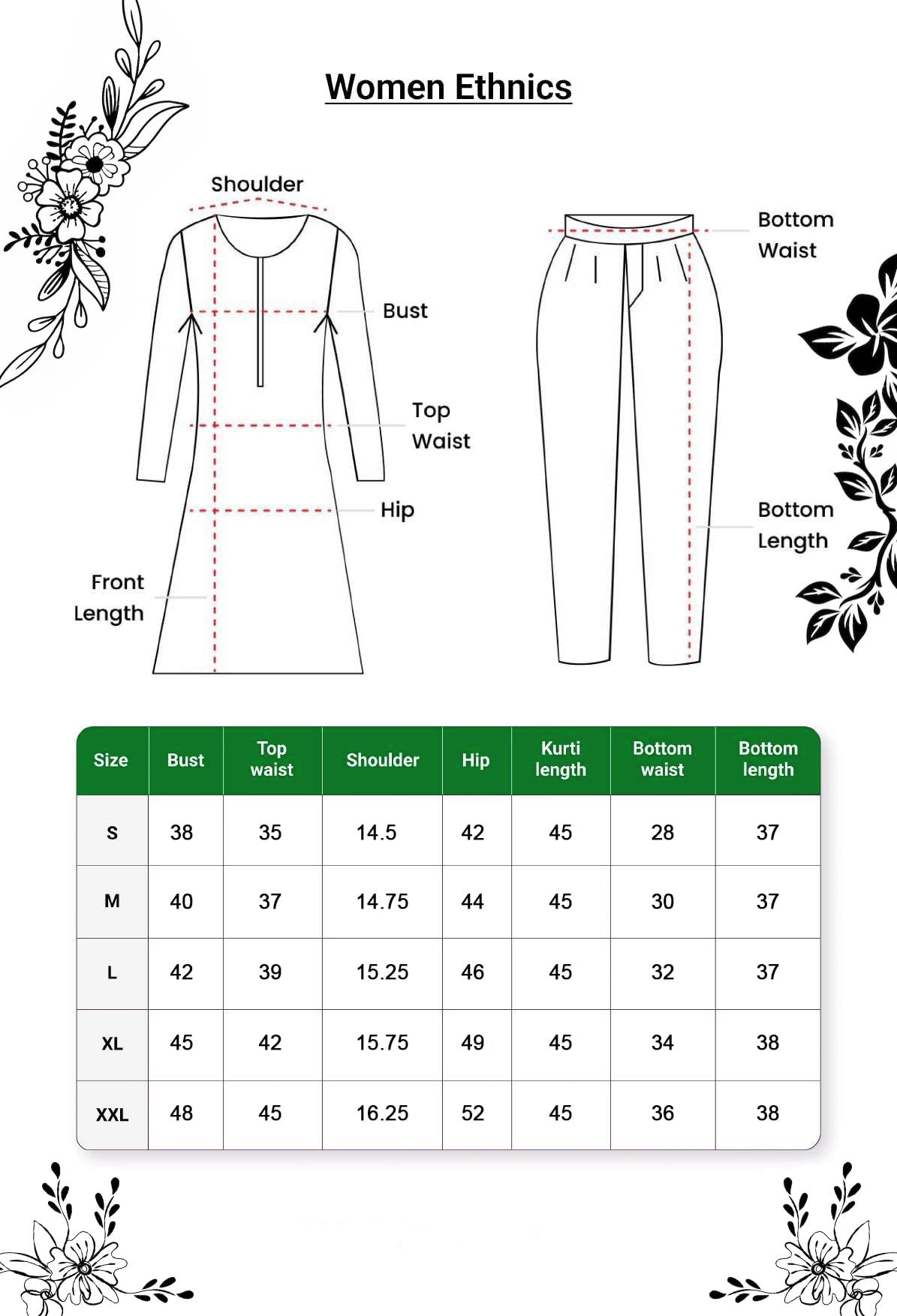 • Style: Straight || Length: Calf Length || Sleeves: 3/4 Sleeves || Size Chart- Kurta-S-36 in, M-38 in , L-40 in , XL-42 in , XXL-44 in,Pant :- S-28 in, M-30 in , L-32 in, XL- 34 in , XXL- 36 in,For More Please refer to the size Chart below.