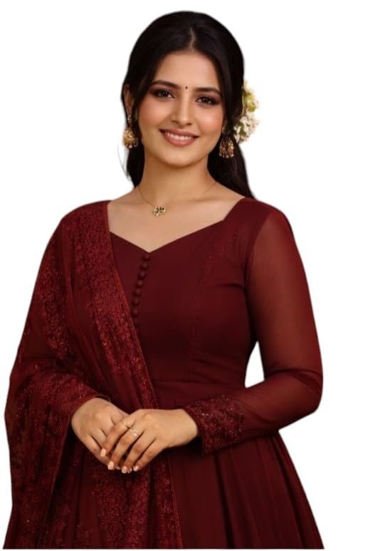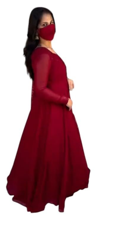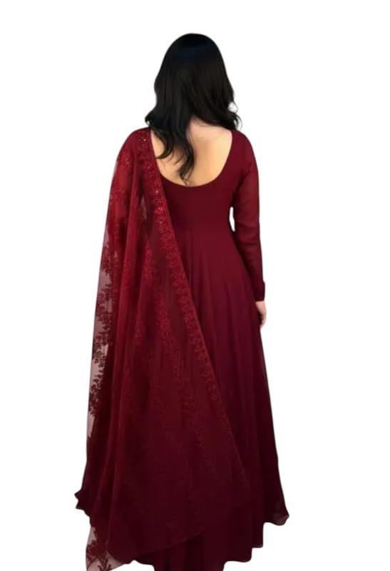 GreenVillage enterprise Designer Faux Georgette Floor Length Red Gown with Embroidered Net Dupatta | Ethnic for Women