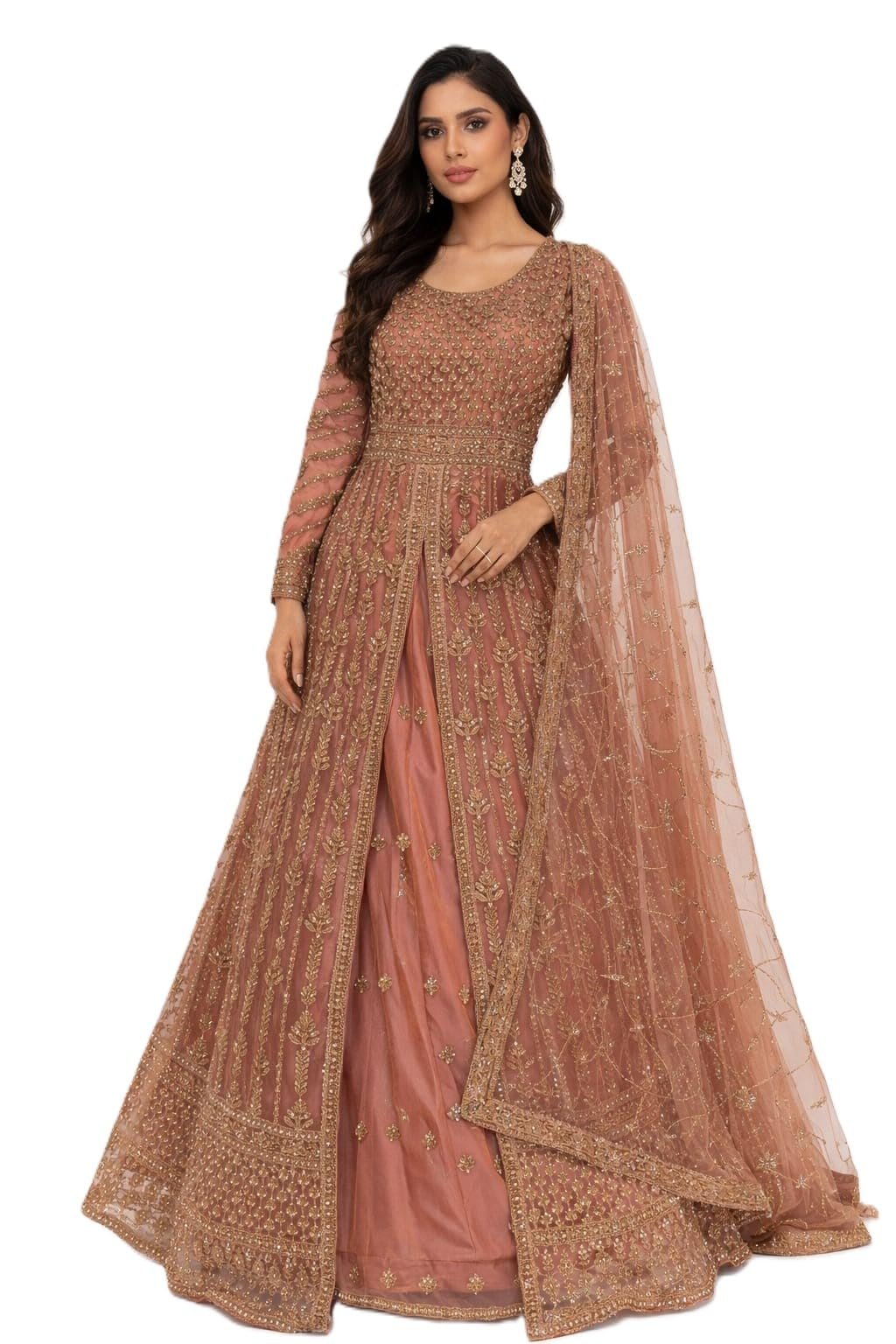 - Elegant brown Anarkali gown with detailed gold embroidery for a rich ethnic look